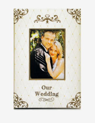 Faux leather bound photo albumAlbum holds 300 photosHolds 3 horizontal 4x6 photos per pageFiligree accent designCover features 4x6 slot for displaying favorite pictureOur wedding embroidered wording detailDimensions: 9 x 13 x 2 inchesImported